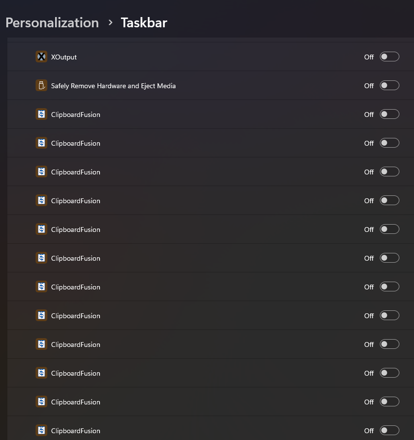 Lately I've noticed the app lagging a lot and I think it has to do with macro usage. I use macros quite a bit in my workflow and I've noticed a few things. First, in Win10/11 if you taskbar settings, you'll see may instances of ClipboardFusion in the hidden icons section. I believe these are remnants of the macro being executed. This makes me wonder with all these entries it is making the app slower to respond, especially while right-clicking and accessing the original CF system tray icon. I am currently seeing this in Windows 11 but also noticed it while running in a Windows 10 VM. I also tried running the latest non-beta with the same results. Is this a bug or something I could fix on my side? Thanks!