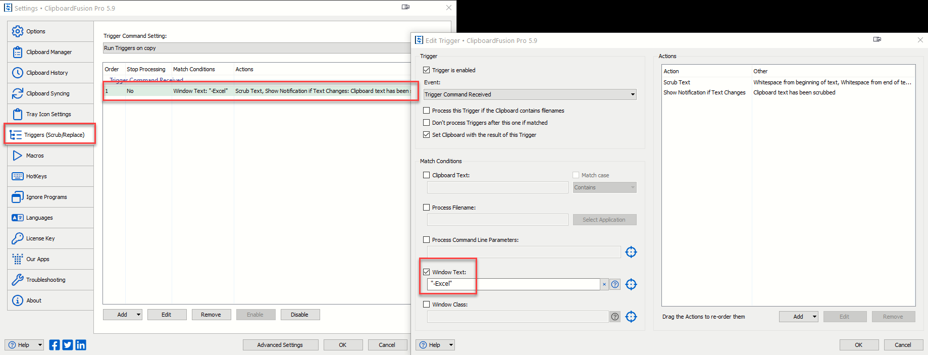 I've attached a screenshot below showing where you can find that trigger. I've also added the line where you can add excel as an exception, so it won't fire on excel windows.