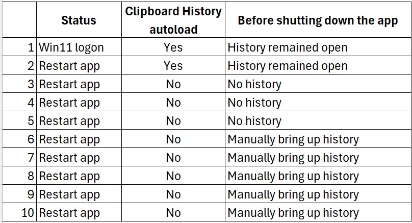 It is quite random when restart wnidows. If the windows remained open, i have carried out some tests with only shutting down and restarting the Clipboard Fusion app. The results are as below: