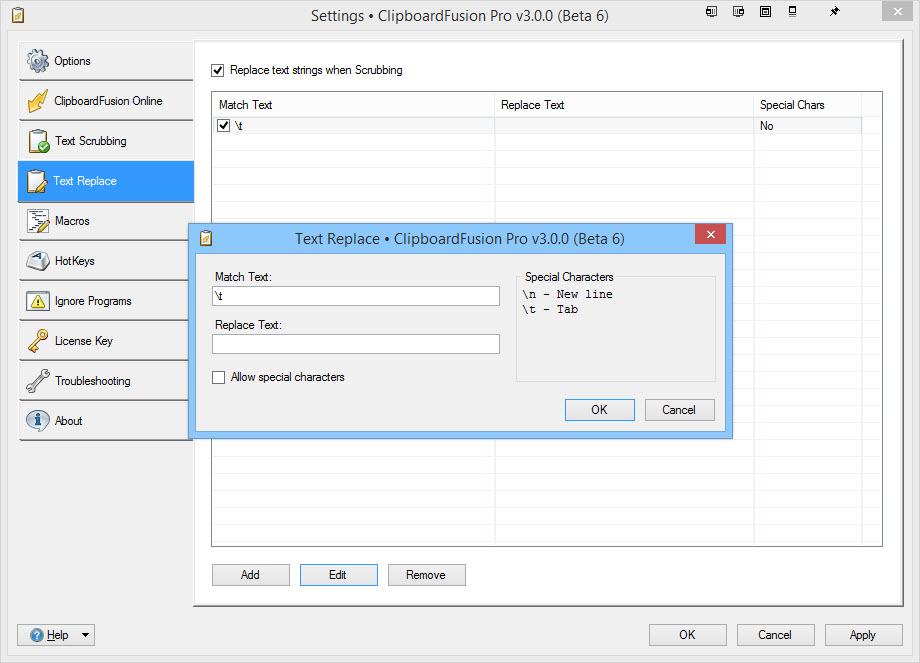 When I copy data in multiple cells from an Excel worksheet, scrub the data with clipboard fusion, then paste the data, a tab character is inserted between the text of the two cells. I'd like to automatically replace the tab characters with a space character. Any idea how to do that?