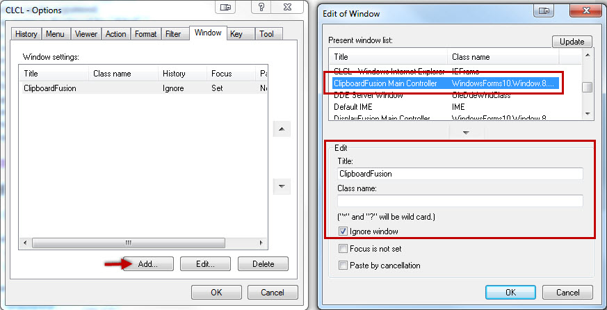 Ok, interesting! I just noticed in my screenshot that that stuff is blank. I didn't actually delete any text though, so maybe it's a bug in the CLCL UI? I only selected the ClipboardFusion entry from the list, and then enabled the "Ignore Window" check box. Could you try doing just that, without modifying any of the options?