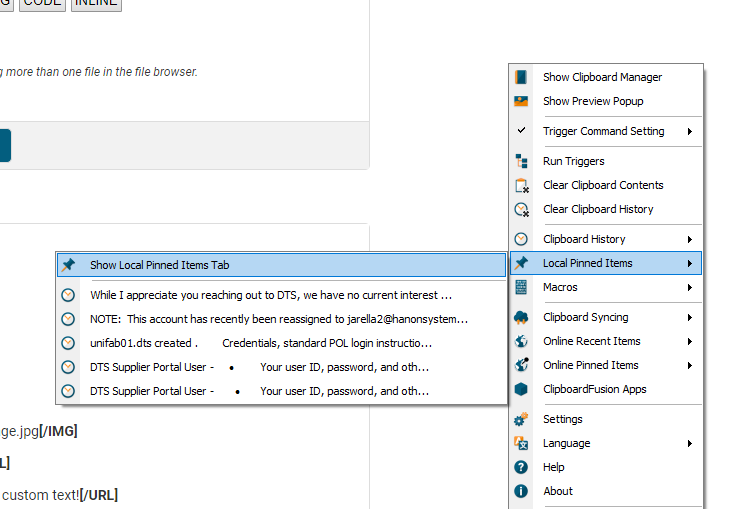 Title says it all. If I try to open the local pinned items tab from Local Pinned Items / Show local pinned items tab, it pops up and immediately disappears. If I am looking at the Clipboard History and select the "Pinned" tab (for local pinned items), it's empty, even though there are clearly some items pinned locally (see image).