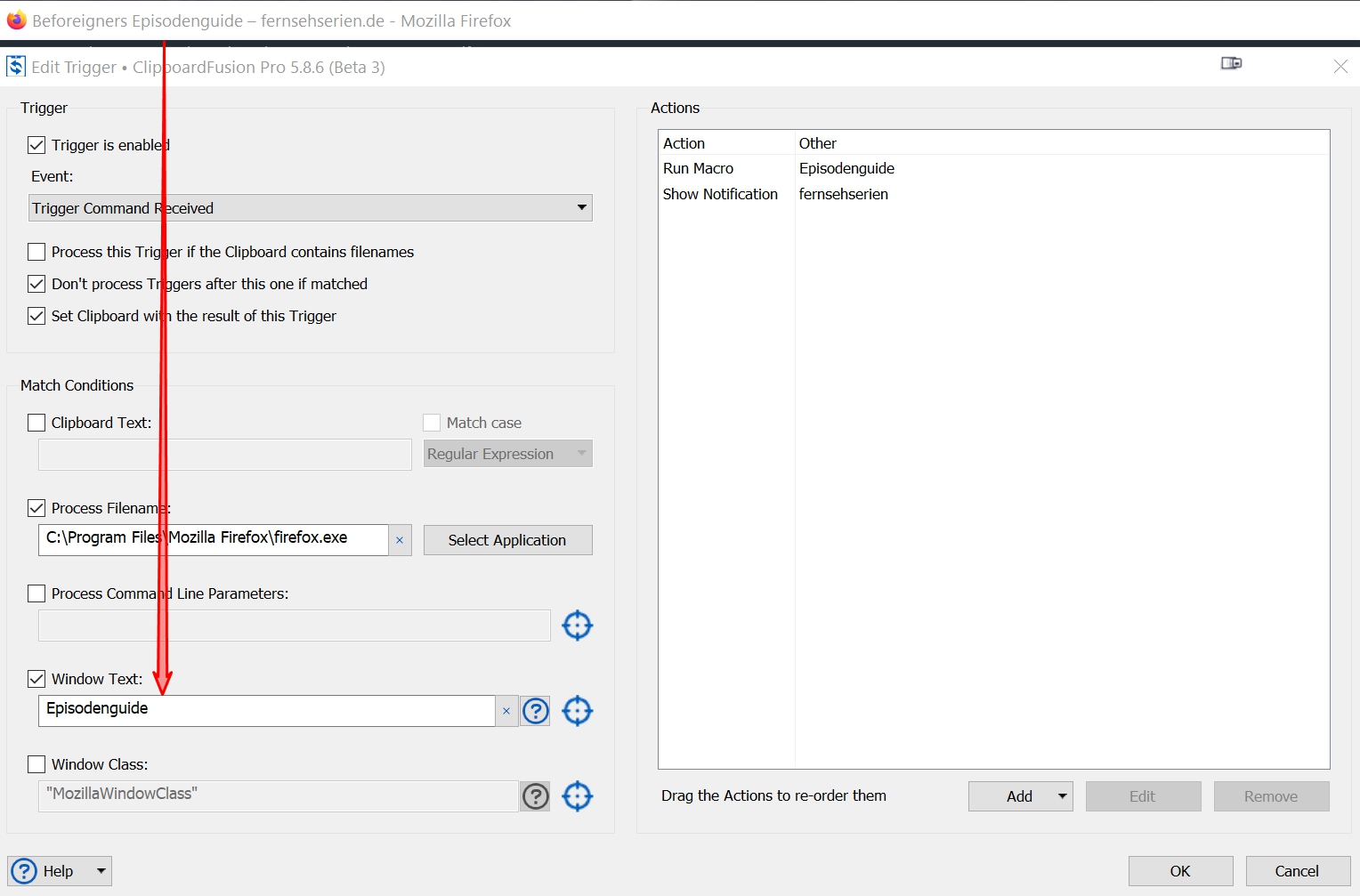 Can you try disabling the "Process Filename" box, so it's just the "Window Text" box enabled, and see if that works?
