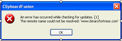 On my laptop, whenever I wake up from hibernation, I get a "beep" and the attached dialog that clipboard fusion couldn't connect to www.binaryfortress.com. Apparently Clipboard Fusion gives up before my wireless connection manages to connect. Could this message be eliminated or the timeout made much longer or the dialog be made less intrusive?